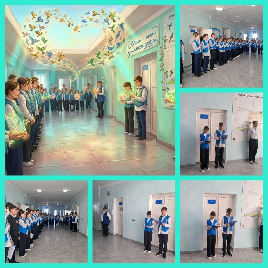 "Адал азамат" Бірыңғай тәрбие бағдарламасы және "Менің Қазақстаным"апталық іс-шаралары аясында-дүйсенбі күндері оқу апталығының басында оқушылар мен педагогтар "Қамқор" жобасы аясында Қазақстан Республикасының Әнұранын орындады. Мектеп құрамы Халықаралық құстар күніне арналды. "Құстар - біздің қанатты достарымыз!"