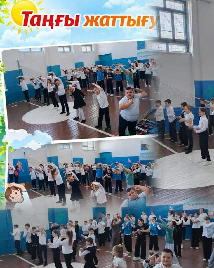 Қазақстан Республикасы Білім министрлігінің бұйрығына сәйкес әр сейсенбі 31.03 сайын мектебімізде барлық оқушылар мен педагогтердің қатысуымен «Адал азамат» Бірыңғай тәрбие бағдарламасының «Өмірге салауатты қадам» ай сайынғы профилактикалық іс-шаралары аясында дене шынықтыру мұғалімі Дюсекеев Д.Ж жетекшілігімен «Дене шынықтыру жаттығулары» тұрақты түрде ұйымдастырылып келеді.