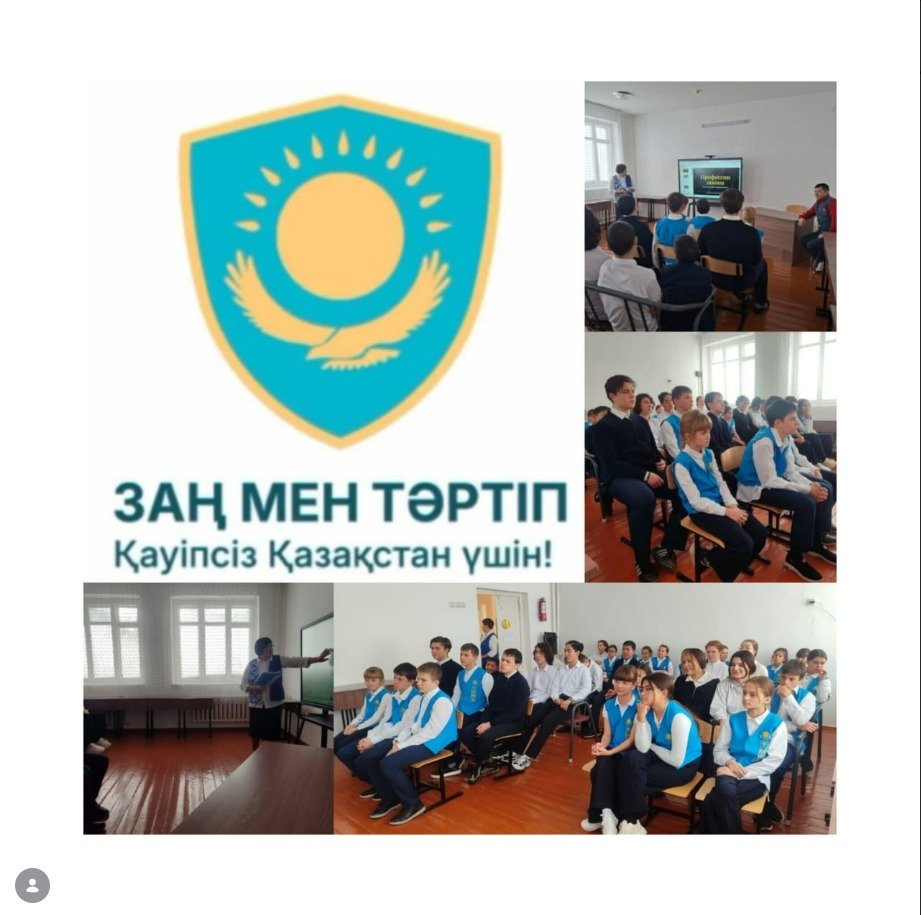 "Адал азамат" Бірыңғай тәрбие бағдарламасын және "Заң және тәртіп" айлығын іске асыру аясында 5-11 сынып оқушылары арасында мектептің кәсіби бағдаршысы Р.х. Мұқанова "заң мамандықтары"іс-шарасын өткізді.