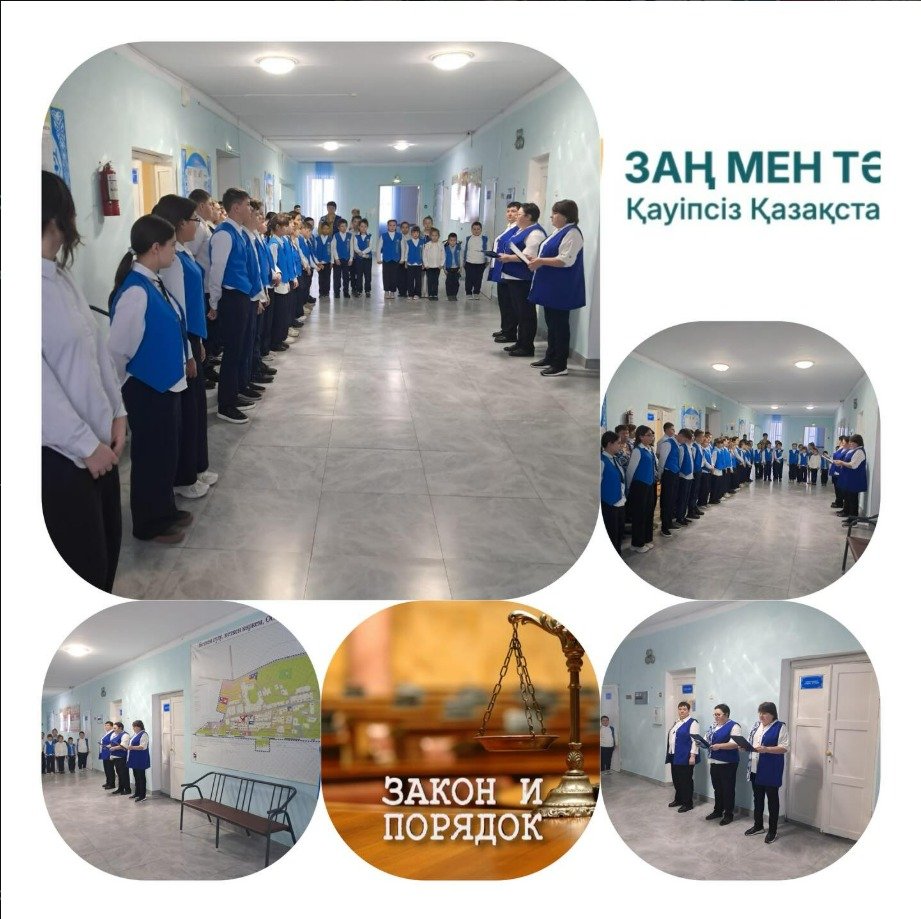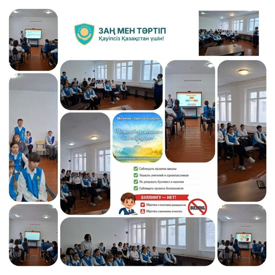 "Адал азамат" Бірыңғай тәрбие бағдарламасы аясында ай сайынғы "Қауіпсіз қоғам" профилактикалық іс-шаралары және "Заң және тәртіп" айлығы аясында 8 қаңтарда жалпы мектептік жиын өткізілді. Мақсаты: "Заң және тәртіп" айлығын ашу, балалар мен мұғалімдердің назарын құқықтық тәрбие тақырыбына аудару, хабардар болу күнделікті өмірде ережелер мен Заңдарды сақтаудың маңыздылығы.