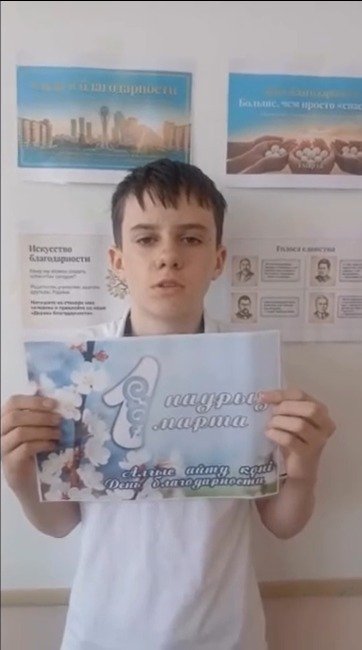 "Адал Азамат "бағдарламасы аясында Алғыс айту күніне арналған іс – шаралар жоспары бойынша" Шабыт " жобасы аясында 7 сынып оқушылары бейне-құттықтау жазды. Құндылық: құру және жаңашылдық.