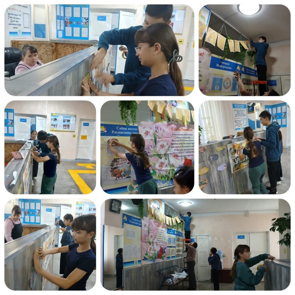 Мектептің өзін-өзі басқару көшбасшылары Мұғалімдер күніне арналған фойені безендірді. Мақсаты мерекелік атмосфераны құру.