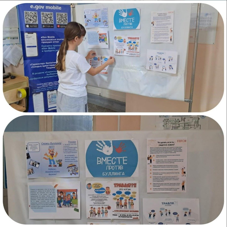 "Адал азамат" Бірыңғай тәрбие бағдарламасы, "ДОСБОЛЛИКЕ" білім беру ұйымында білім алушыларды қорлау/буллинг пррииоактикасы бағдарламасы және " буллингке жоқ деп айтайық!"мектеп парламентінің жетекшілері"буллингке қарсы бірге" атты ақпараттық стенд дайындады