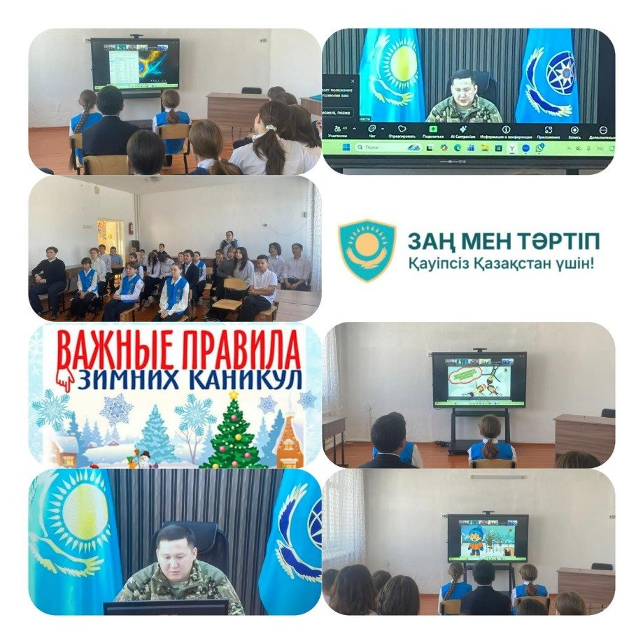 "Адал азамат" Бірыңғай тәрбие бағдарламасы шеңберінде ай сайынғы" Қауіпсіз қоғам " профилактикалық іс-шаралары және демалыс уақытына арналған іс-шаралар жоспары бойынша 29.12 "Окушылардың қауіпсіздігін қамтамасыз ету", 5-11 сынып оқушылары Ақмола облысы ТЖД өткізген онлайн кездесулерге қатысты.