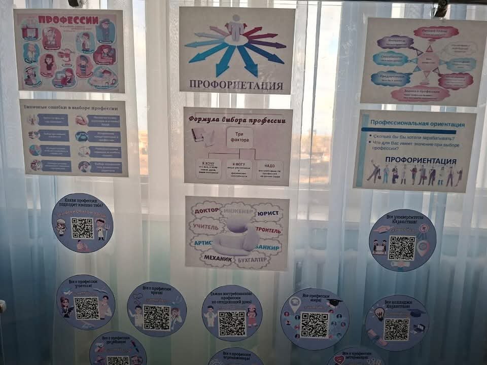 Мектептің кәсіби бағдаршысы Р. Х. Мұқанова оқушыларды кәсіптік бағдар беру бойынша тақырыптық стенд дайындады.