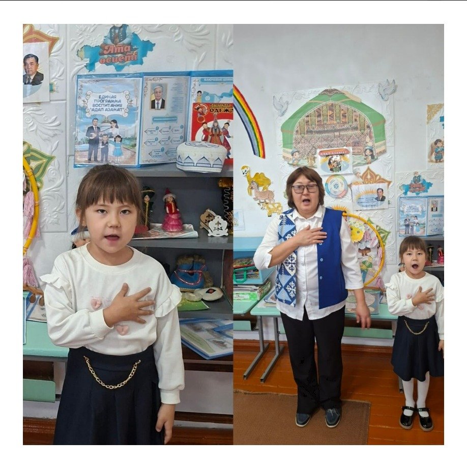"Адал Азамат" Бірыңғай тәрбие бағдарламасын, "Менің Қазақстаным" апталық іс-шараларын іске асыру аясында мектепалды топ тәрбиеленушілері Қазақстан Республикасының Мемлекеттік Әнұранын орындады.